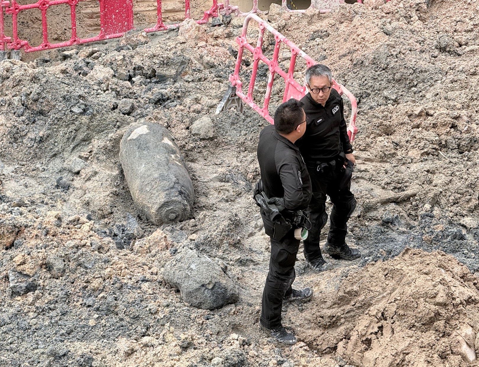 今午(19日)12時18分,濱海街16至22號一地盤工人報案,指發現一枚1.5米長、直徑0.5米、重1000磅的懷疑戰時炸彈,遂報警求助。警員接報到場緊急疏散近300人,封鎖附近街道,並通知爆炸品處理課人員到場處理,多輛消防車亦在場戒備。