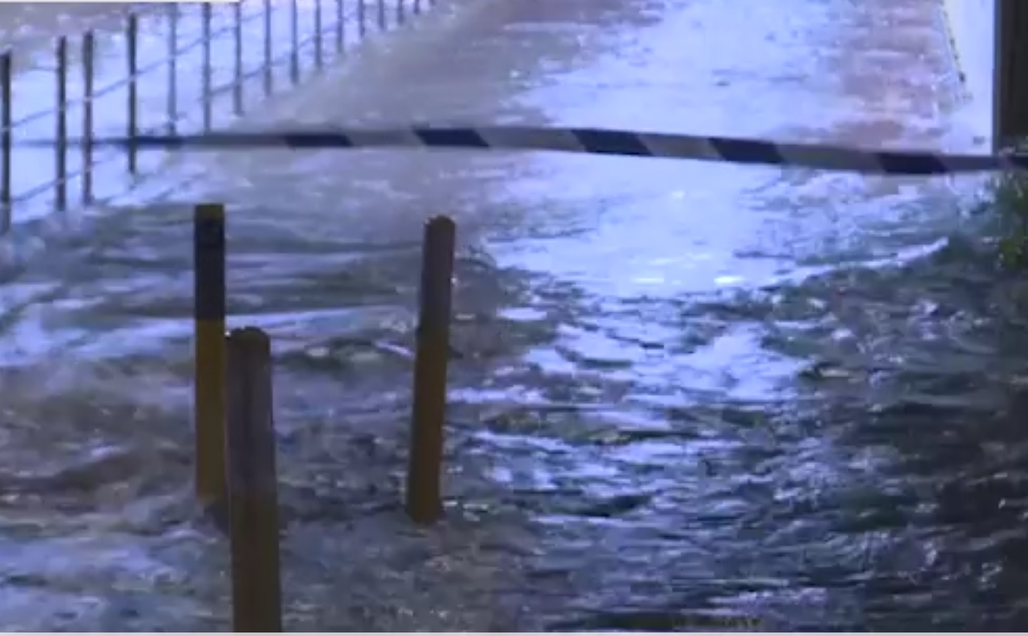 風暴潮下,沙田城門河附近的行人隧道近清晨6時,海水沿岸湧入隧道,導致水浸。