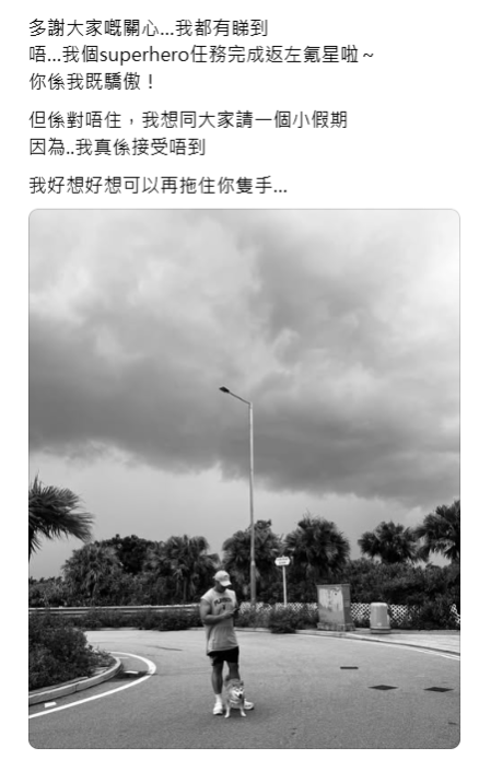 何偉豪的社交帳號,充滿與女友的甜蜜點滴。他曾寫下:「多謝你!嫌我煩都要講100次Love U,以後都要笑得開心」,如今承諾卻成了最痛回憶。他女友在發文中強忍悲痛:「多謝大家嘅關心……但係對唔住,我想同大家請一個小假期,因為…我真係接受唔到,我好想好想可以再拖住你隻手……」