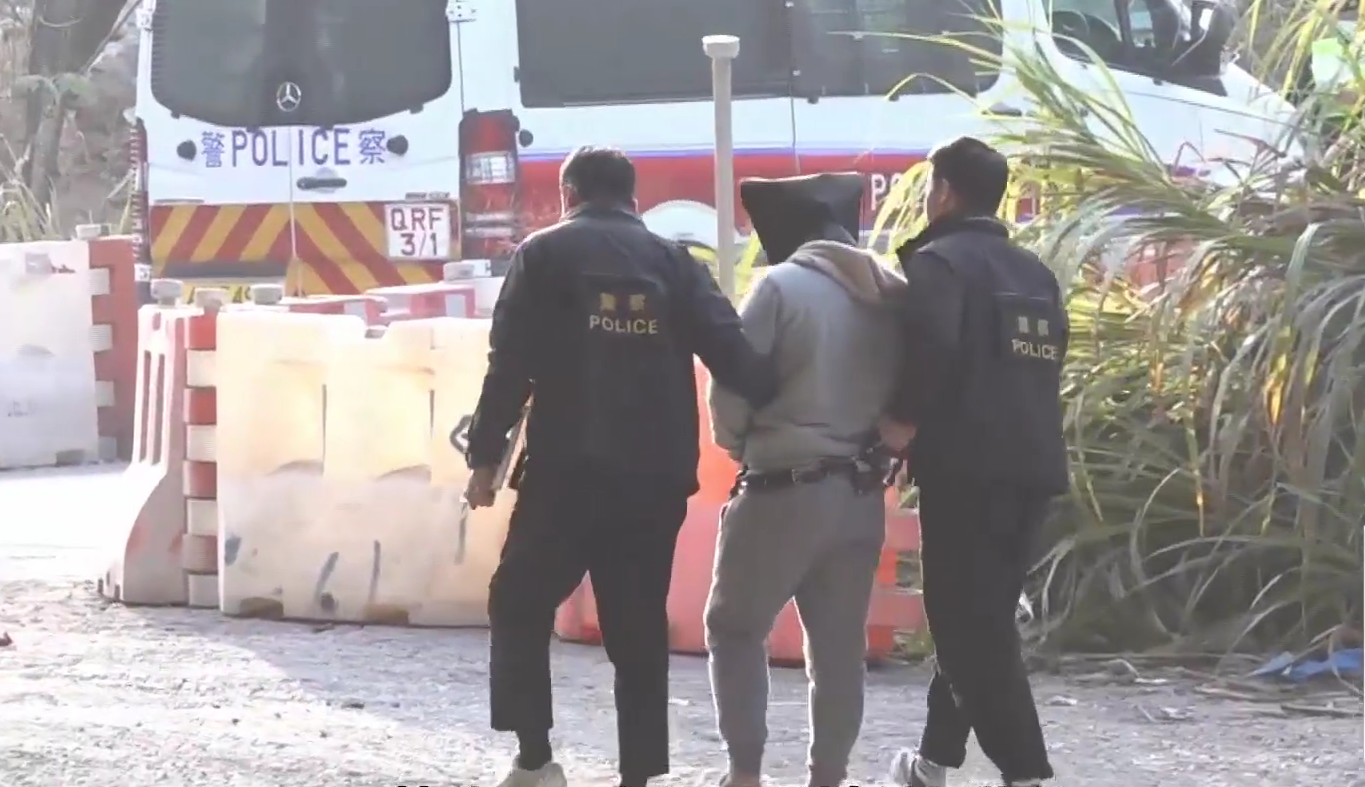 警方周五分別拘捕29歲及32歲男子,其中一名疑犯黑布蒙頭、腰纏鐵鏈、鎖上手銬,下午被押抵現場,警員帶同人形公仔在現場重組案情,約40分鐘離開。